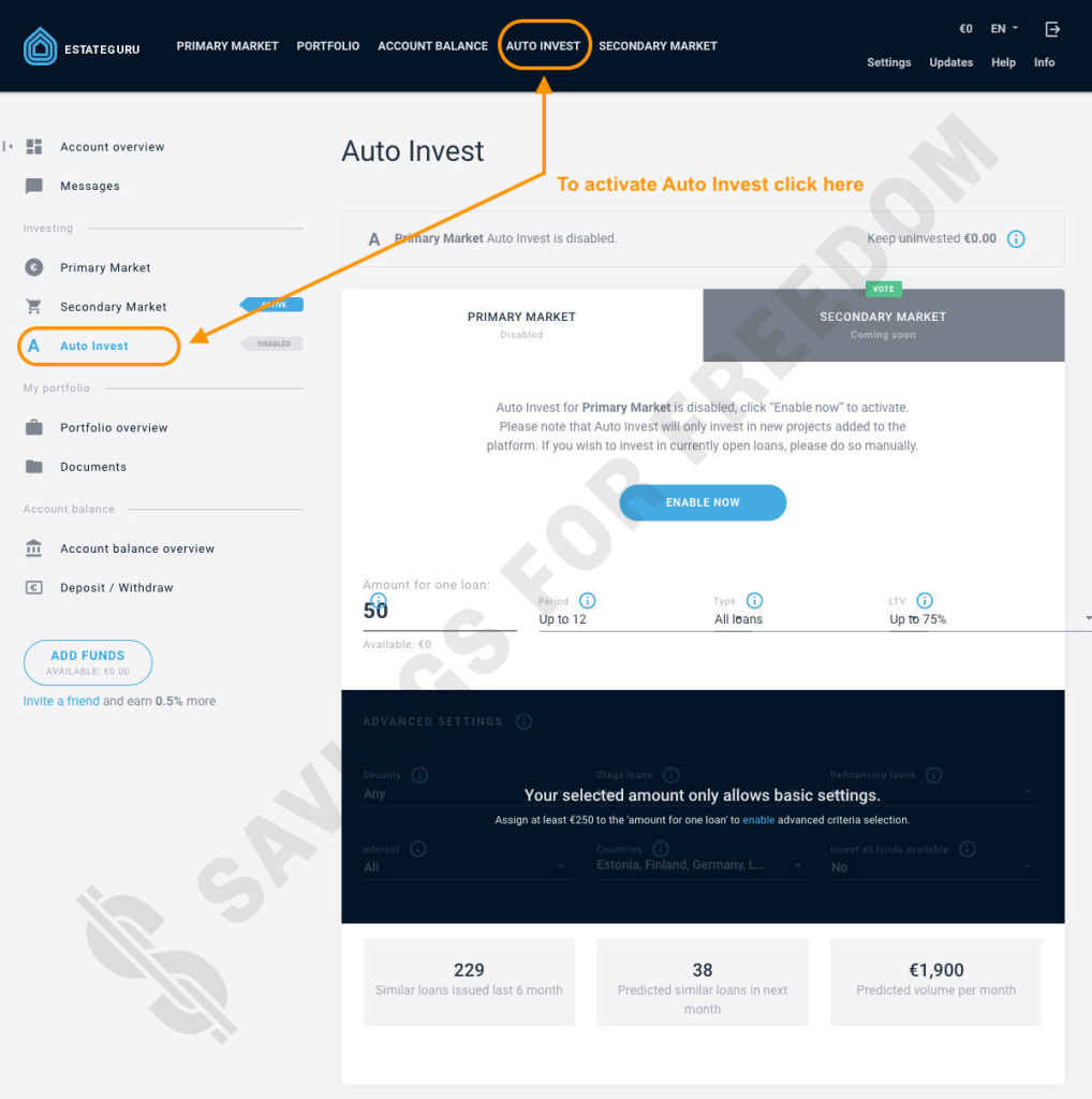 When you transfer funds to EstateGuru, you can activate the Auto Invest feature by clicking on Auto Invest in the left or top menus.