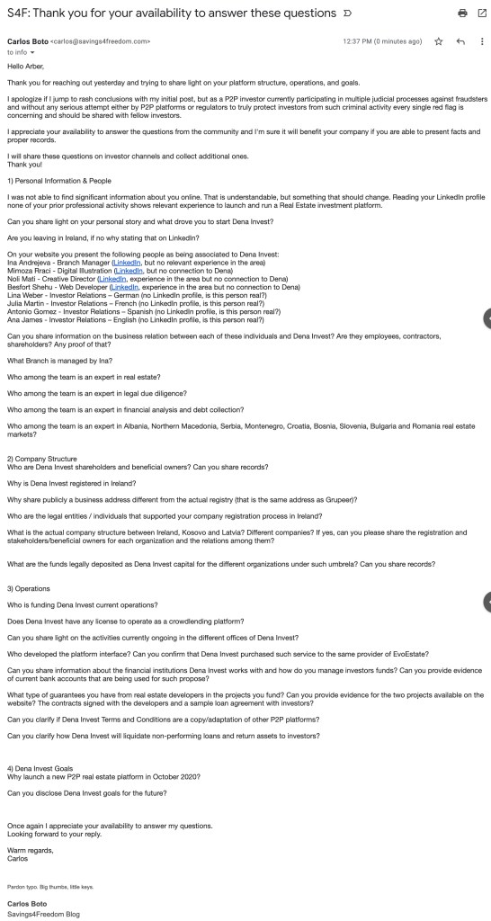 Last week I was quick to jump into conclusions based on the lack of information available about Dena Invest. I apologize if I jump to rash statements with my initial post, but as a P2P investor currently participating in multiple judicial processes against fraudsters and without any serious attempt either by P2P platforms or regulators to truly protect investors from such criminal activity every single red flag is concerning and should be shared with fellow investors.