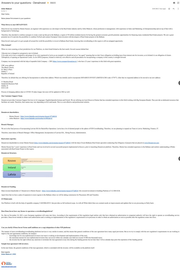Dena Invest is a very recent real estate investment platform that promotes opportunities in the Balkan countries (Kosovo, Albania, Northern Macedonia, Serbia, Montenegro, Croatia, Bosnia, Slovenia, Bulgaria and Romania). The initial discussions in P2P investor groups raised concerns associated to the initial registration address of the company and that triggered a number of message exchanges that are explained in the text below.